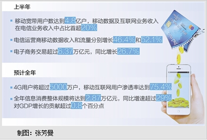 三是移动应用融合渗透,新型信息消费增长势头迅猛。今年上半年,电信运营商移动数据收入和流量分别增长了46.4%和52.1%,移动数据及互联网业务收入在电信业务收入中的占比,也由去年同期的15.09%提升至20.93%,首超20%。与此同时,企业不断利用移动互联网平台和海量用户数据改造传统型融合应用,创造出移动电子商务、移动支付、移动搜索等新型应用模式。基于移动互联网的应用正在从游戏、音乐等娱乐类业务转向金融、交通、医疗等重点领域,催生和激发了大量新的消费需求。