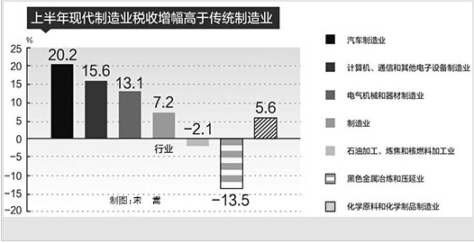 就制造业来看,上半年汽车制造业税收增长20.2%,计算机、通信和其他电子设备制造业税收增长15.6%,电气机械和器材制造业税收增长13.1%,均明显高于石油、金属、化工等传统制造业。