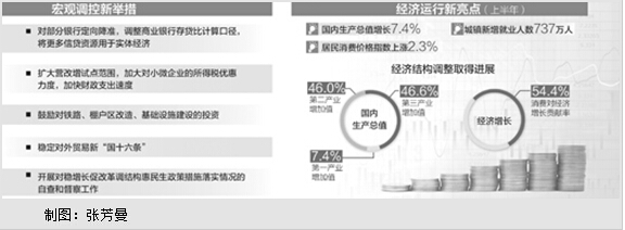 首先,经济总体处在预期调控目标之内。上半年,我国经济增长7.4%。规模以上工业增加值同比增长8.8%。消费基本稳定,出口逐月好转,政府主导的基础设施建设和棚户区改造投资有效对冲了房地产投资下行,稳定了投资需求。就业形势继续改善,城镇新增就业人数737万人,完成全年目标的73.7%。物价总水平基本稳定,居民消费价格指数上涨2.3%。