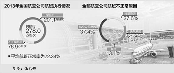 2013年,全民航不正常航班达76.9万班次,平均航班正常率72.34%。不正常的原因中,航空公司自身的原因占37.4%,较上一年有所下降;流量原因占27.6%,较上一年增加2.6%;天气原因占21.8%,与上一年基本持平;其他原因为13.1%。