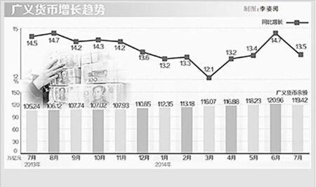 “从当前M2增速看,尽管有所回落,但仍在正常范围内。一是与今年以来M2的平均增长速度比,7月份当月M2增长13.5%,比1—6月份M2月平均增长速度约高出0.2个百分点,比年初预期调控目标高出0.5个百分点。二是与宏观经济指标基本是相适应的。M2增速与GDP和CPI增速之和的相互关系处于正常水平。从理论和经验上看,M2增速应略高于GDP与CPI增速之和,一般认为高出2个百分点左右较为适宜。1—7月,CPI累计上涨2.3%,上半年GDP增长7.4%,M2增速高于二者之和约3.8个百分点。”盛松成分析说。