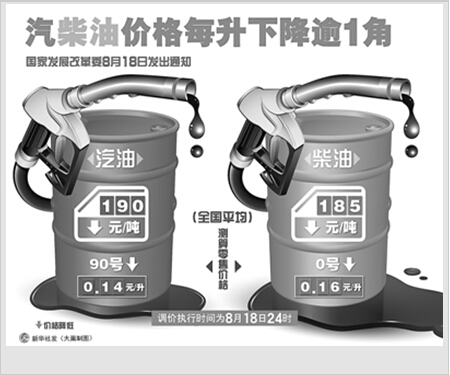 当日,国家发展改革委发出通知,决定将汽、柴油价格每吨分别降低190元和185元,测算到零售价格90号汽油和0号柴油(全国平均)每升分别降低0.14元和0.16元,调价执行时间为8月18日24时。