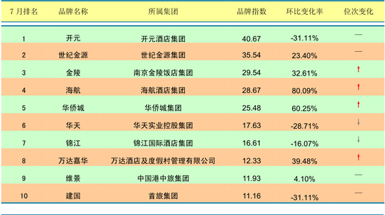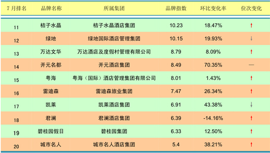 总体上,7月各大酒店品牌的位次变动较大,这也导致较多的排名上升品牌被TOP20之外的名次下降品牌所对冲。在迈点品牌风云榜TOP20中,排名上升的有11家,下降的有4家,持平的为5家。排名上升的品牌中,万达文华升幅最快,较上月上升11位;其次是雷迪森和碧桂园假日,均上升7位。这三大品牌全都进入风云榜TOP20。此外,城市名人与万达嘉华也分别上升5位和4位。