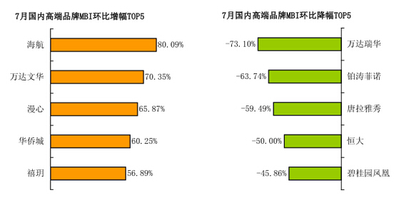 在国内高端酒店品牌TOP20中,7月品牌指数环比增长的有16家,下降的有4家。增幅最大的为海航,得益于媒体指数的飙升,品牌指数较6月增长80.09%;同样受益于与此的还有万达旗下豪华品牌万达文华,其品牌指数环比增长70.35%,增幅仅次于海航。此外,漫心、华侨城和禧玥的品牌指数增长也较明显,增幅分列3-5位,分别为65.87%、60.25%、56.89%。