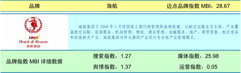 本月海航大酒店的品牌指数为28.67,较上月增长80.09%,增幅居各品牌之首;位次列第4,环比上升2位。从各指标数据来看,搜索、舆情、运营指数有小幅变动,媒体指数增长95.49%,推动品牌指数大幅上升。