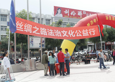 趁着繁忙行程的间隙,法律团队一行抓紧时间来到人群密集的广场,摆开义务法律咨询的服务桌,拉开丝路法治文化宣传的横幅,将宣传册向来往的群众发放,便开始了此次活动。他们和每个前来咨询的人耐心交流,在解决问题的同时,渗透法治文化的知识和理念。