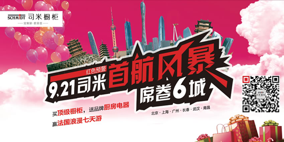 8月司米橱柜扬帆起航,首批专卖店开业大幕已徐徐拉开,首航风暴席卷六城,北京、上海、广州、长春、武汉、南昌六大省会城市司米橱柜专卖店盛大开业。值此开业之际,为回馈广大消费者的支持,9月1日~9月21日,SCHMIDT司米橱柜“六城联动首航风暴”第一波开业优惠钜献,让消费者以最优的价格享受到充满法兰西浪漫风情的橱柜产品!还有各种幸运大奖、惊喜优惠——品味法国原装进口红酒、现场游戏赢现金券、满额送品牌厨电、浪漫法国七天双人游的终极大奖……