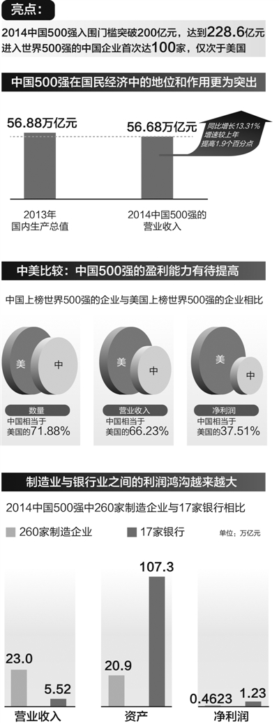 9月2日,中国企业联合会、中国企业家协会连续第十三次向社会发布“中国企业500强”排行榜。2014年中国企业500强的入围门槛为营业收入达到228.6亿元, 首次突破200亿元大关。中石化、中石油、国家电网跻身“两万亿俱乐部”,位列榜单前三名。中国进入2014世界企业500强榜单的企业也创纪录地达到100家,成为世界500强新晋企业的最主要来源地。
