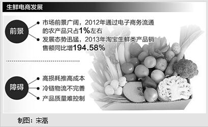 中国电子商务研究中心的数据显示,2012年我国进入流通领域的农副产品价值总额为2.45万亿元,但通过电子商务流通的农产品只占1%左右。不少业内人士认为,生鲜市场是电商领域的蓝海,市场前景可观。面对这个巨大的蛋糕,各路企业纷纷布局。