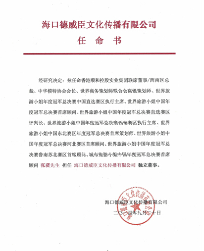 海口德威臣文化传播有限公司任命书