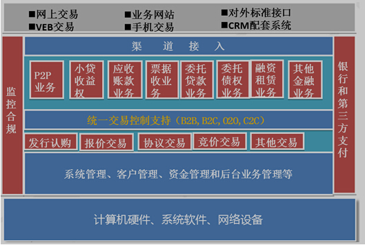该平台支持P2P、B2B、B2C和O2O等业务模式,凭借先进的交易平台,完善的交易管理机制,提供包括金融产品创新、金融资产的发布、登记、托管、转让、结算、清算等交易与服务。