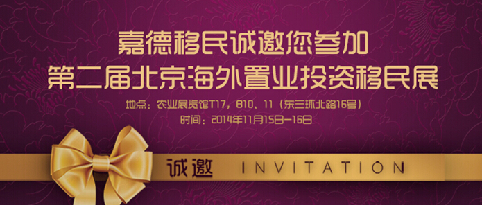 第二届北京海外置业投资移民展将于2014年11月15日-16日在北京农展馆盛大召开,嘉德移民将携美国、加拿大、意大利、葡萄牙、澳大利亚等20多个国家数百个优质项目参展,集中展示优质移民项目及海外投资项目。