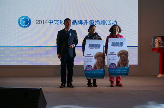 会议现场,中宠股份副总裁梁洪文先生代表公司向北京好猫好狗伴侣动物基地和幸运土猫两个宠物救助组织进行爱心宠物粮食捐赠。