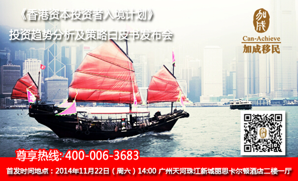 欲知详情可报名参加2014年11月22日下午14:00-17:00在广州珠海新城丽思卡尔顿二楼一厅,由羊城晚报.移民留学版与加成移民携手举办《香港资本投资者入境计划》投资趋势分析及策略白皮书发布会,加成移民在香港2014年司政报告发表之际,就香港资本投资者入境计划进行详尽研究,联合羊城晚报.移民留学版,特邀请香港中国金融协会副主席兼秘书长及中国银行投资产品顾问主管,联合发布《香港资本投资者入境计划》投资趋势分析及策略白皮书。此次白皮书发布会将权威讲解及深入剖释香港投资产品的合理可行性。活动概况如下: