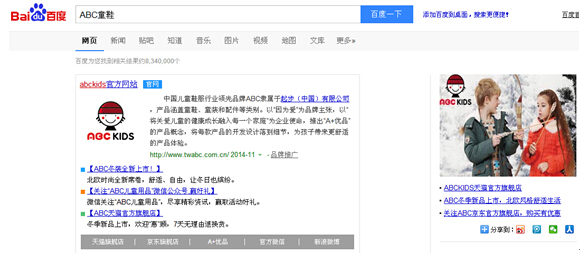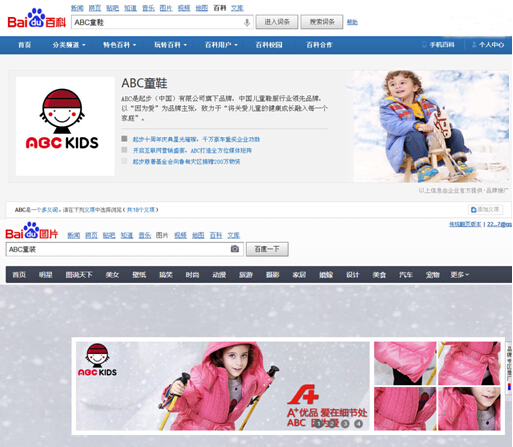 ABC在百度品牌专区的形象建立,不仅在百度首屏黄金位置快速抓住用户眼球,同时最大程度地将ABC品牌植入百度新闻、网页、知道、视频、百科及无线端等聚集用户流量的专区,实现官网、产品线、广告、活动等多重信息同步曝光。当用户在PC端和移动端百度页面搜索ABC童装、ABC童鞋品牌词及通用词时,在首屏第一位位置便能看到ABC品牌最权威的官方信息,如此一来,消费者可以更加直接、更加深入的了解和体验到ABC品牌产品及其他各方面资讯。