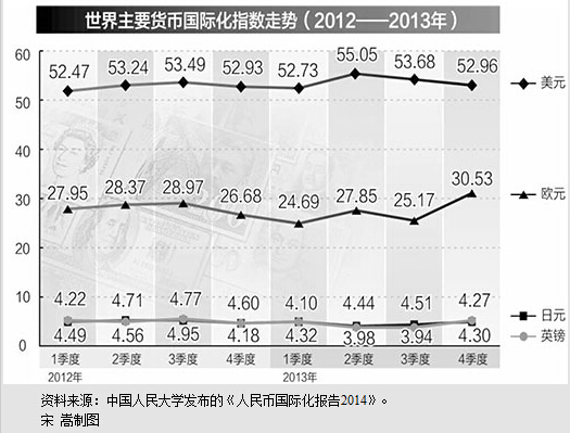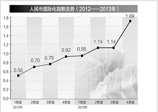 未来5年,人民币国际化将达到新的高度。中国人民大学发布的人民币国际化指数,2009年底时只有0.02%,2013年底提高到1.69%,2014年9月底估计已达2%左右。“过去5年,人民币国际化指数上升了90倍左右。考虑到英镑和日元的国际化指数近几年大致在4%左右,所以只要没有重大不利事件发生,未来5年人民币很有希望实现与英镑、日元并驾齐驱”,央行货币政策委员会委员、中国人民大学校长陈雨露说。