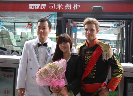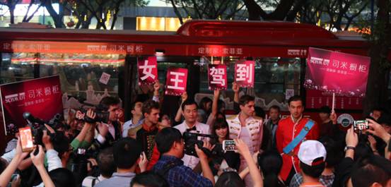据悉,11月22日当天下午,一辆载着司米的“第一次”获得者——“女王陛下”的“童话大巴”先后巡游到体育中心、岗顶BRT公交站、维多利广场、购书中心等天河区最为繁华的商业区,接受浪漫热情的法国男神献礼。围观群众呼声不断。司米第一次的拥有者——女王压轴登场,由四位帅气男士牵引下车,“司米橱柜,女王驾到!”的口号响起,伴着众人的迎接,“国王”为“女王”倾献法国皇室迎接礼仪,奉上玫瑰花束,现场氛围再掀高潮,共同见证“司米橱柜首位尊贵客户”的华丽登场。