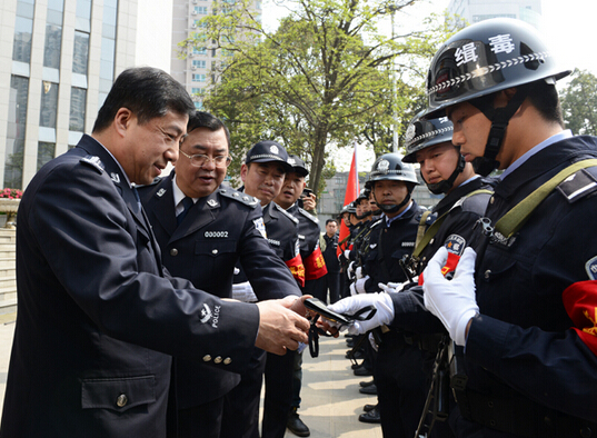 省长助理、省公安厅厅长孙立成在全省公开查缉毒品机动队成立仪式上查看缉毒队员的专业装备。