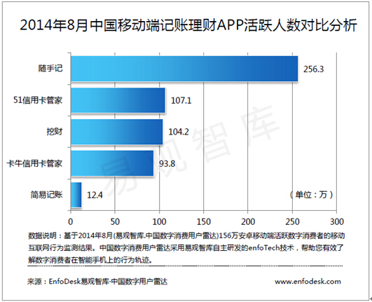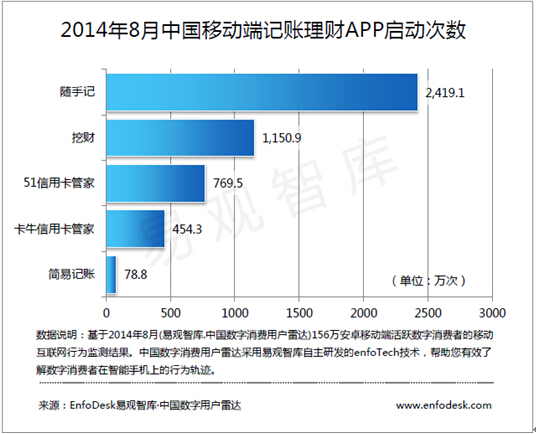 来自易观智库最新发布的《中国记账理财APP移动市场研究报告2014》调研数据显示,随手科技旗下的随手记、卡牛信用卡管家系列产品,打开4次以上的核心月活跃数据已经超过整个品类其它产品核心月活跃的总和。