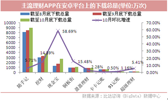 而据第三方机构对国内金融理财APP在主流安卓分发平台上的下载量数据统计显示,随手记在主流Android平台的下载总量达8961万次,几乎为后十位同类产品的总和。