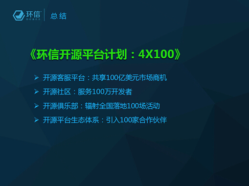 第四步、环信将打造即时通讯云开源平台生态体系,这一生态体系,不仅是发布开源平台产品,不仅做开源社区,不仅建开源俱乐部。更将打通产业链上下游,引入100家合作伙伴。