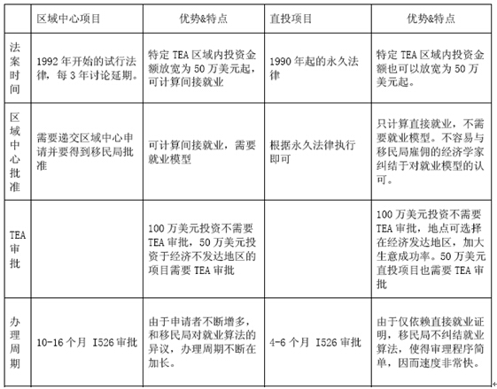 美国EB5投资移民法最初在1990年由国会通过,当时只规定了一种投资方式,即美国海外的投资人在美国投资100万美元,解决10个就业机会,就给予绿卡。在执行了两年后,不少投资人反映他们可以投资100万美元,但是没有时间来美国设立新的企业,或者接管已有的亏损企业,具体进行管理。1992年,美国国会在听取了各方面的意见后,推出了“区域中心”概念,即允许各地成立“区域中心”。相对于区域中心投资移民项目,直投移民项目的最大特点是可以在投资获得股权收益的同时获得美国绿卡。同时,直投项目的I526审批速度快,大概在4-6个月左右即可获批I526。美国EB5区域中心项目和直投项目优势及特点的详细对比: