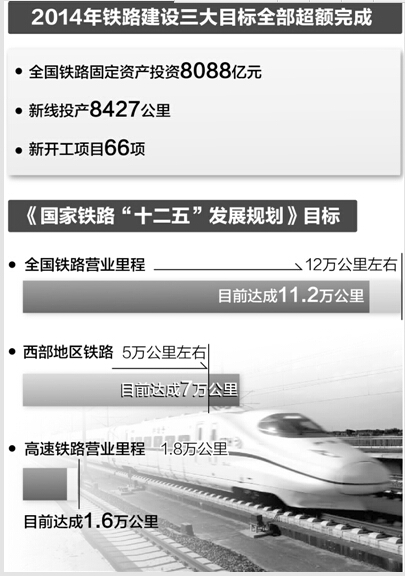 “去年我国铁路固定资产投资完成年度计划的比例,是近年来最好的。”盛光祖介绍,2014年初,铁路建设设立了三大目标,即全国铁路固定资产投资8000亿元、新线投产7000公里、新开工项目64项。事实证明,三大目标全部超额完成。