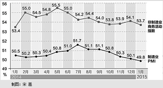 中国物流与采购联合会、国家统计局服务业调查中心2月1日发布的2015年1月份中国制造业采购经理指数(PMI)为49.8%,较上月下降0.3个百分点,两年多来首次跌破50%荣枯线,显示当前经济下行压力仍不容忽视。其中,新订单指数回落到50.2%,为2013年3月份以来的最低值。从调查来看,有49.7%的企业反映市场需求回落。