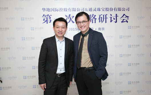 通灵珠宝CEO沈东军(右)和华地集团副总裁、百货事业部总经理徐志强(左)