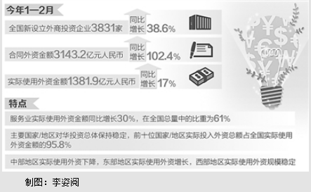 服务业实际使用外资高速增长。1—2月,服务业实际使用外资金额843.5亿元人民币,同比增长30%,在全国总量中的比重为61%;其中金融服务、运输服务业实际使用外资规模较大,分别为305.5亿元人民币、46.6亿元人民币。