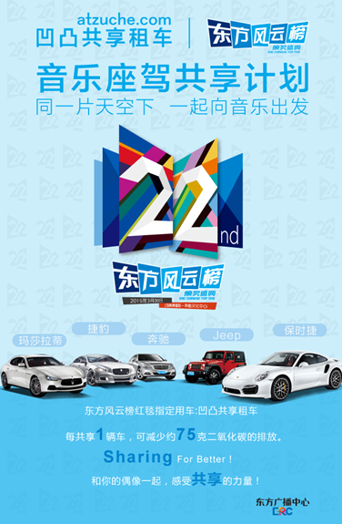 与此同时,凹凸共享租车还将召集22辆老百姓的闲置车辆作为“音乐共享座驾”共享给幸运听众驾驶。东方广播、动感101微信将同时招募一批支持内地原创音乐的搭车听众,与驾车者一起开着豪车共赴3月30日东方风云榜颁奖盛典现场,共享一段绿色环保的音乐之旅。颁奖盛典当天下午,音乐共享座驾发车仪式将在广播大厦举行。