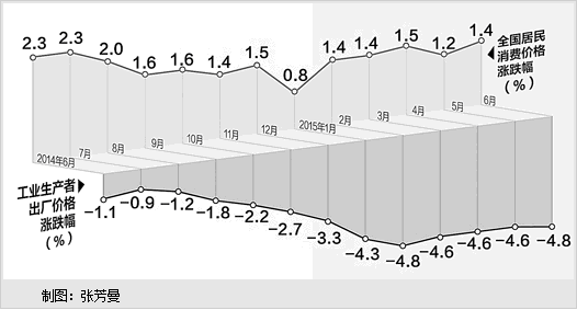 国家统计局9日发布的数据显示,6月份价格形势平稳,全国居民消费价格指数(CPI)环比持平,同比上涨1.4%;工业生产者出厂价格指数(PPI)环比下降0.4%,同比下降4.8%。上半年,全国居民消费价格总水平比去年同期上涨1.3%,工业生产者出厂价格指数下降4.6%。