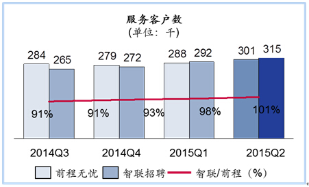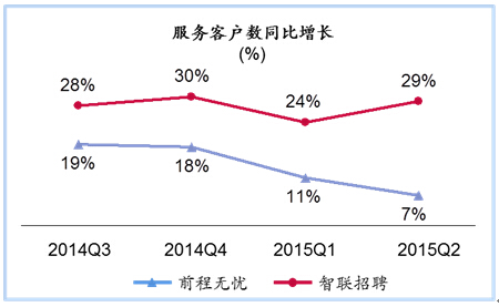 智联招聘4-6月独立雇主数为315,358,同比增幅达29%;前程无忧同期独立雇主数为300,681,同比增长7.3%。这一次,智联不论在客户的绝对数量上还是同比增速上都完胜竞争对手。在客户的绝对数量上,智联从上一季度(1-3月)开始赶超前程无忧;而在客户的同比增长率上,智联已经是连续4个季度跑赢对手了。拥有较多的独立雇主数可以在未来给公司带来更多的业务机会。