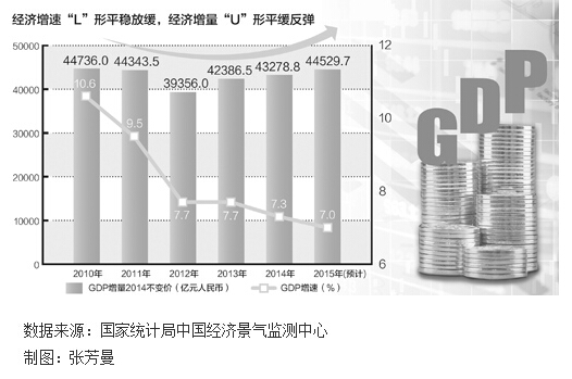 在经济增速呈现“L”形平稳放缓的同时,我国经济增量已经走出了一个平缓的“U”形反弹趋势。据测算,2010年,我国的经济增速是10.6%,按2014年不变价计算的增量是44700多亿元人民币,2015年假定实现7%的增速,不变价增量是44500多亿元人民币,为近5年来最高,几乎与2010年10.6%的增速所对应的增量相当。
