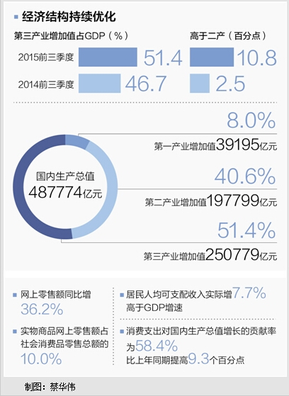 首先,产业结构的调整在继续推进,产业结构在继续优化,突出表现在服务业增长较快,产业结构由原来的工业主导向服务业主导转变的趋势更加明确。前三季度,第三产业增加值占国内生产总值的比重为51.4%,高于第二产业10.8个百分点。内需结构进一步改善。前三季度,最终消费支出对国内生产总值增长的贡献率为58.4%,比上年同期提高9.3个百分点。城乡居民收入差距进一步缩小。前三季度,农村居民人均可支配收入实际增长快于城镇居民人均可支配收入1.3个百分点,城乡居民人均收入倍差2.83,比上年同期缩小0.03。节能降耗继续取得新进展。