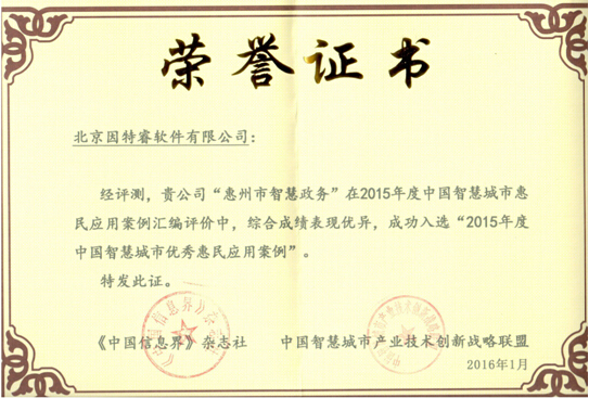 (因特睿获 “2015年度中国智慧城市优秀惠民应用案例”证书)