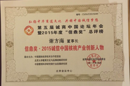 以“弘扬中华商道文化 共铸中国诚信梦想”为主题的第五届时代先锋诚商中国论坛,于年2016年1月15日在北京会议中心胜利召开,董事长谢方海获得“信鼎奖•2015诚信中国核桃产业创新人物”荣誉!