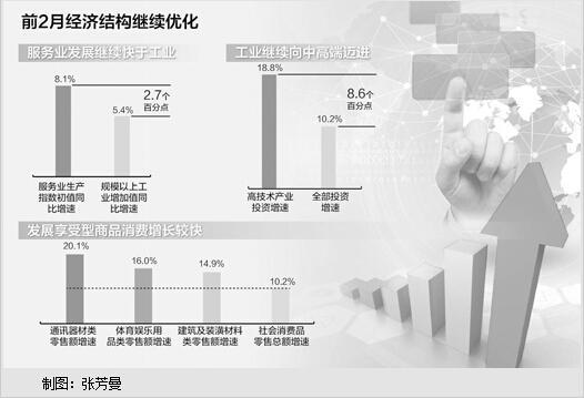 新产业发展方兴未艾。1—2月份,全国网上商品和服务零售额同比增长27.2%。其中,网上商品零售额增长25.4%,增速比社会消费品零售总额快15.2个百分点。网络购物带动快递业务迅猛增长。1—2月份,全国预计完成快递业务量同比增长45.8%。信息消费成倍增长,1月份移动互联网接入流量同比增长120.9%。