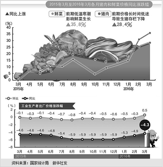 国家统计局11日发布数据显示,2016年3月,全国居民消费价格总水平(CPI)同比上涨2.3%,涨幅与上月相同。当月全国工业生产者出厂价格(PPI)环比由降转升,比上月上涨0.5%,是2014年1月份以来的首次上涨。