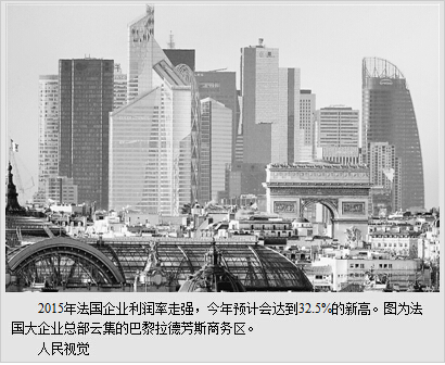 该研究所认为,法国经济回暖得益于消费与企业投资增长。首先,经历去年底巴黎恐袭事件导致的短暂低迷之后,消费出现激增。油价走低带来的低通胀与实际收入增加,大大提升了法国人的购买力。其次,法国企业利用低油价并采取降低劳动力成本等措施增强竞争力,带来了利润的增长。2015年法国企业的利润率达到31.4%,在一年内提高了1.8%。该研究所认为,2016年法国企业的利润率预计达到32.5%,这将是2008年底以来的最高点。另外,受到贷款利率下调与税收激励措施的影响,法国企业的投资增势不减,预计今年第一季度增长0.7%,第二季度为0.8%。该研究所称,欧洲央行采取的宽松货币政策使得企业的融资更加便利。