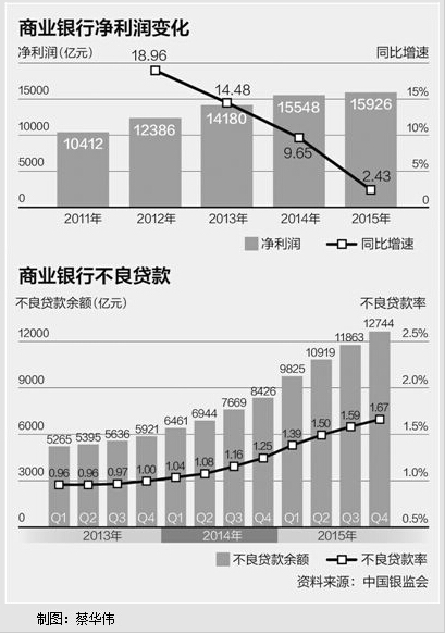 相比盈利状况,银行的资产质量、不良贷款率水平的高低更受市场关注。银监会发布的数据显示,2015年四季度末,商业银行不良贷款余额增至1.27万亿元,较2014年增加4318亿元,增幅达到51.25%;不良贷款率为1.67%,较2014年末上升0.42个百分点。