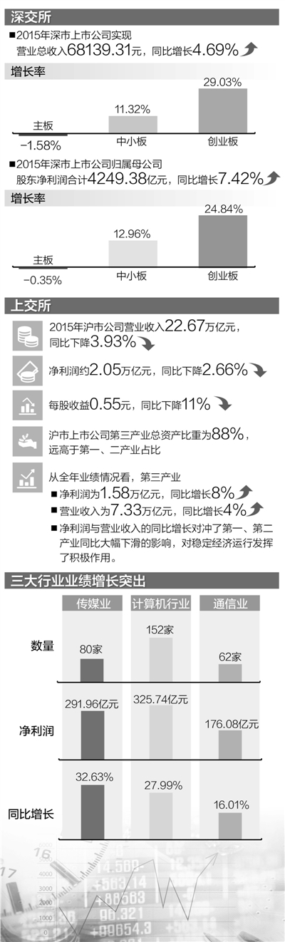 以深市上市公司为例,尽管整体保持增长态势,但业绩出现明显分化。深交所综合研究所所长何杰介绍,剔除金融行业,2015年深市上市公司的营业总收入增速只有3.22%,净利润下降1.98%,主板公司的净利润甚至下滑14.38%。传统行业中的采矿业净利润连续4年下滑,有色金属冶炼和压延加工、黑色金属冶炼和压延加工全行业亏损。