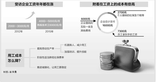 “不涨工资,招不来人;工资涨上去,企业吃不消”“降成本,别的成本还有戏,用工成本,我看难!”记者在浙江省的杭州和嘉兴、河南省的郑州和洛阳采访时,企业普遍反映用工成本上涨迅速,特别是在近年企业效益不理想的情况下,对企业构成较大压力。