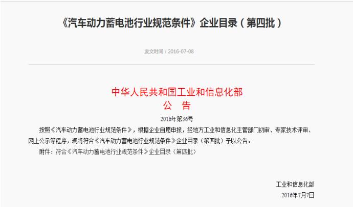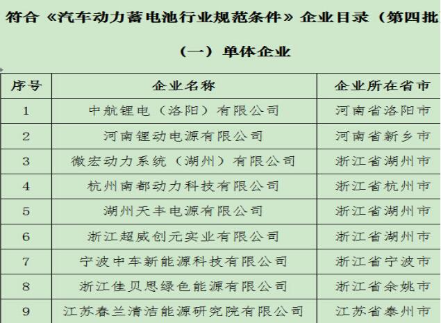 工信部发布《汽车动力蓄电池行业规范条件》企业目录(第四批)