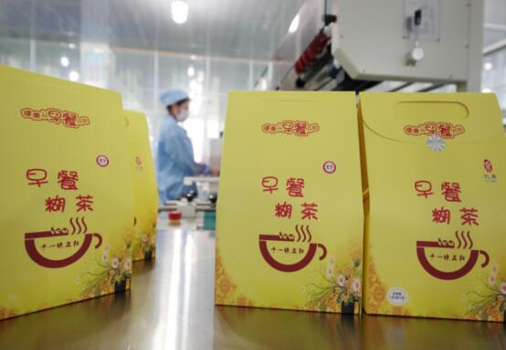 礼米公司员工在生产车间包装好的早餐糊茶