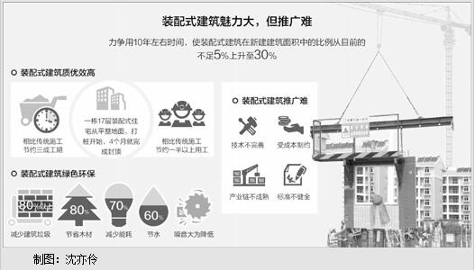 9月底,国务院出台《大力发展装配式建筑的指导意见》(以下简称《指导意见》),提出力争用10年左右时间,使装配式建筑在新建建筑面积中的比例从目前的不足5%上升至30%。我国要大力推广的装配式建筑有哪些独特的魅力?推广过程中又面临哪些困难,应当如何解决?