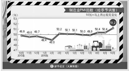 中国物流与采购联合会、国家统计局服务业调查中心1日发布,10月份中国制造业采购经理指数(PMI)为51.2%,较上月上升0.8个百分点,自2014年10月份以来首次回升到51%以上。主要分项指数普遍回升,高于去年同期1个百分点以上。综合来看,PMI回升特点明显,回升幅度较大,回升覆盖面较广,显示当前经济走势稳中有升。