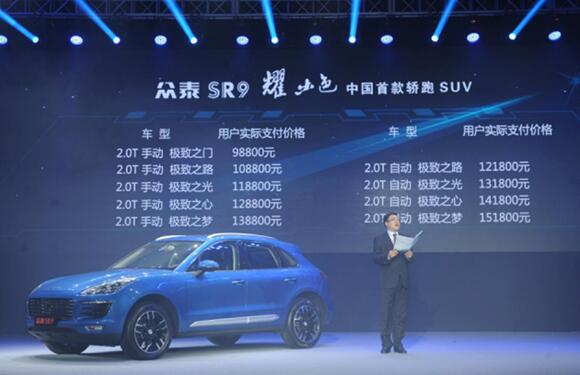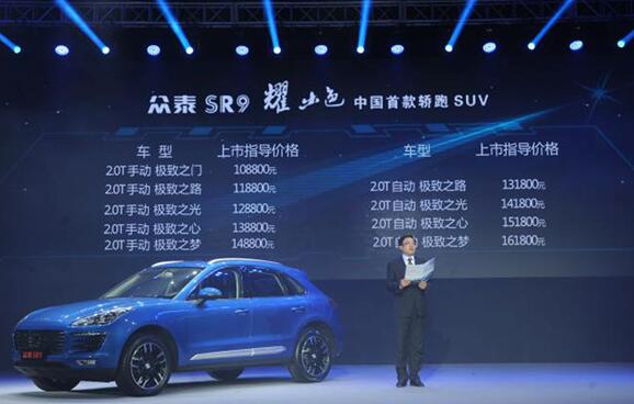 11月11日,在大家享受“双十一”狂欢时,以“耀出色”为主题的众泰SR9上市发布会在北京五棵松乐视生态体育中心盛大举行。众泰SR9定位于中型SUV,开创了中国轿跑SUV风潮,其长宽高分别为4744mm、1929mm、1647mm,轴距长达2850mm,有极致之门、极致之路、极致之光、极致之心、极致之梦共五个版本九款车型,售价区间为108800元——161800元。