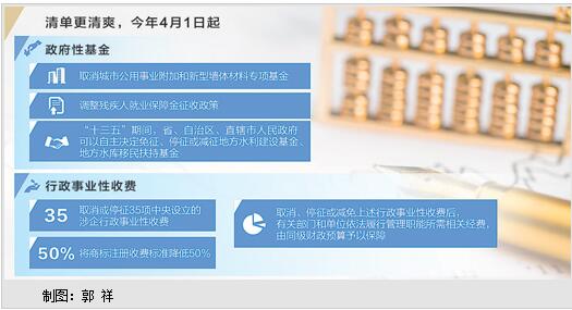 据统计,2013年以来,各地区各部门持续推出减费降费措施。今年4月1日起,根据财政部发布的通知,又取消了城市公用事业附加和新型墙体材料专项基金,调整了残疾人就业保障金征收政策,同时提出,“十三五”期间,省、自治区、直辖市人民政府可以自主决定免征、停征或减征地方水利建设基金、地方水库移民扶持基金。行政事业性收费方面,今年4月1日,取消或停征了35项中央设立的涉企行政事业性收费,将商标注册收费标准降低50%,同时明确,取消、停征或减免上述行政事业性收费后,有关部门和单位依法履行管理职能所需相关经费,由同级财政预算予以保障。