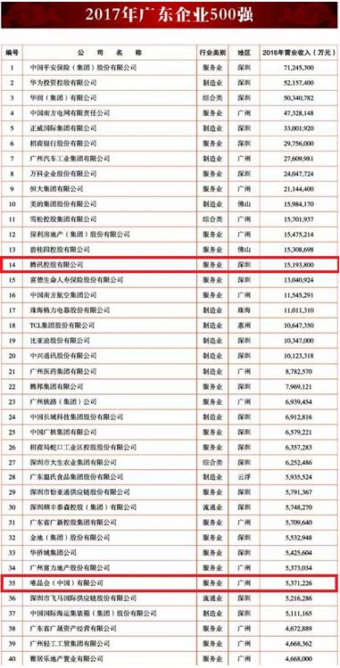 8月3日,广东省企业联合会、广东省企业家协会揭晓“2017年广东企业500强”榜单,腾讯、唯品会分别位列互联网企业第一、二名,并连续多年入围该榜单。